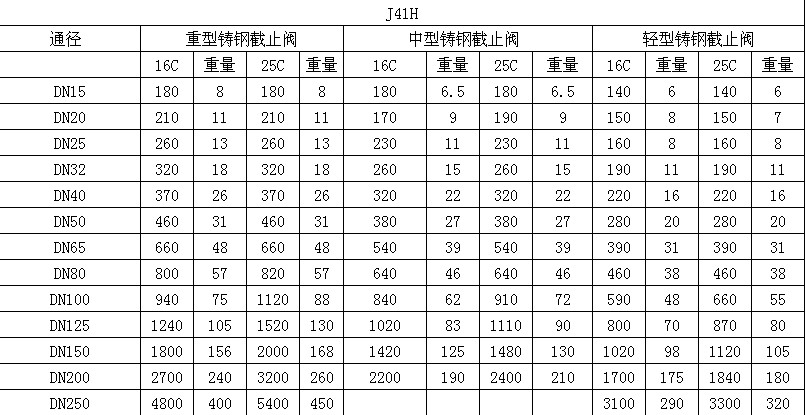 | 通徑 | 重型鑄鋼截止閥 | 中型鑄鋼截止閥 | 輕型鑄鋼截止閥 | |||||||||||