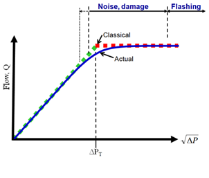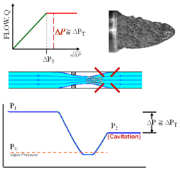 圖1和液阻流相關(guān)的討論是經(jīng)典的討論,并意味著從非突變壅塞流完全阻塞流。在現(xiàn)實(shí)中,在壓力下降接近,但低于計(jì)算值ΔPT,通常有一些形成蒸汽氣泡和一定程度的空化。圖5顯示了作為流量的變化從非窒息完全阻塞流到底發(fā)生了什么。