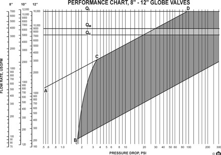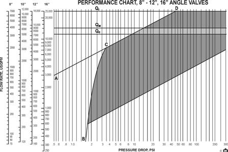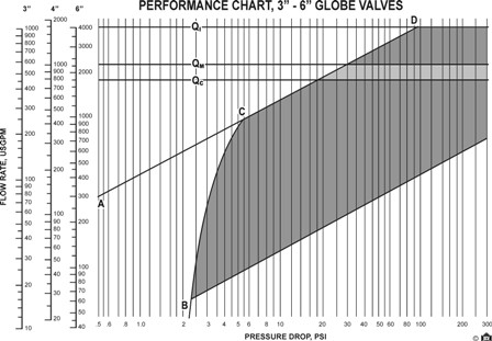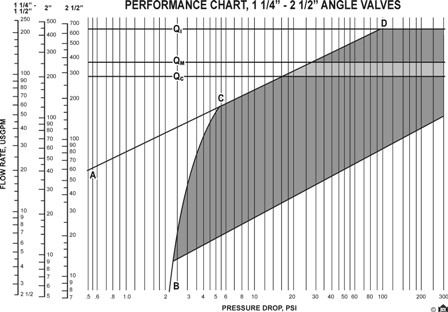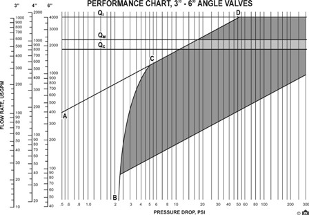 解決方案上游的壓力為20 psi,下游為零。因此,壓降是20 psi。微量向上直到你交叉陰影區(qū)域的下邊緣。然后,微量水平2的流量圖和閱讀21加侖。這是最小流量。現(xiàn)在繼續(xù)向上沿20磅線陰影區(qū)域的上邊緣。微量水平和閱讀210 GPM最大流量。有效的流量范圍內(nèi),然后,是21-210 GPM。