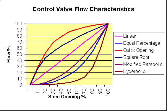最常見的特性示于上面的圖所示。 流過閥的百分比作圖對(duì)閥桿位置。 所示的曲線是典型的從閥門的廠家。 這些曲線是基于閥門兩端的恒定壓降,被稱為固有流量比例。
