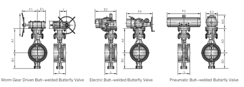 | A1 | B1 | M1 | E1 | F1 | J | Do1 | A2 | B2 | E2 | F2 | A3 | B3 | E3 | F3 | M3 | Worm gear | Electric | Pneu- matic | ||