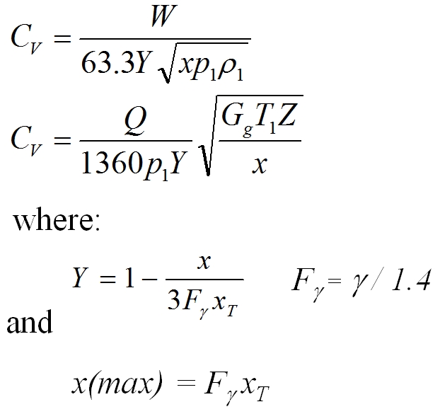 頂部的方程是一個(gè)我們一直使用到目前為止,但重新解決CV而W。這種形式是適當(dāng)?shù)臍怏w和蒸氣(包括蒸汽)流量的質(zhì)量流量單位(磅/小時(shí)),其中上游的密度是已知的。第二個(gè)方程,這只不過是第一個(gè)方程,用適當(dāng)?shù)娜莘e單位流量單位轉(zhuǎn)換(SCFH)和密度計(jì)算出的比重,絕對(duì)溫度,絕對(duì)壓力和壓縮因子。