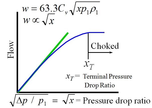 如果我們要進(jìn)行流量測(cè)試,流量和壓降比之間的實(shí)際關(guān)系將會(huì)如由彎曲的藍(lán)線,不直。在較低的壓力降比的流程如下的直線,但它偏離越來越多,直到最后,壓降比進(jìn)一步增加,不產(chǎn)生任何額外的流量。在這一點(diǎn)上我們說流動(dòng)已經(jīng)成為了。由于氣體的流量,我們選擇呼叫水平軸代替三角洲P軸X軸,我們定義了壓降比的流動(dòng)變得完全阻塞為終端的壓力降比符號(hào)x,并給它T,T代表“終端”。