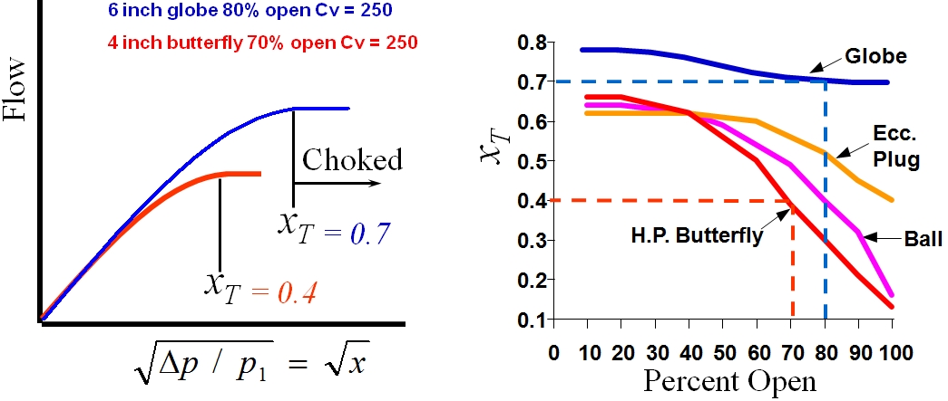 在左邊的圖藍(lán)線代表通過的流量比例控制閥,其中XT0.7。(即,流量就會(huì)窒息時(shí),壓力降為70%的P1。作為一個(gè)例子,這可能是在80%開上線將簡(jiǎn)歷約250 6英寸的截止閥。一個(gè)4英寸的高性能蝶閥在70%開放的操作也有一個(gè)品種約250。雖然這兩個(gè)閥門具有相同的流量(CV),通過蝶閥流圖(左側(cè)圖紅線)看起來比流程圖不同通過截止閥。這是因?yàn)樗?.4個(gè)文本,即流扼流圈時(shí)的壓降為40% P1。在較低的壓力降比,流量是通過閥相同,但壓降比的增加,在蝴蝶閥的流量開始瞄準(zhǔn)壅塞流在截止閥的流量。了解這會(huì)幫助你理解為什么一個(gè)尺寸計(jì)算表明,所有的流量條件相同的情況下,閥門一風(fēng)格將需要一個(gè)比較大的品種是一個(gè)不同風(fēng)格的閥門所需。