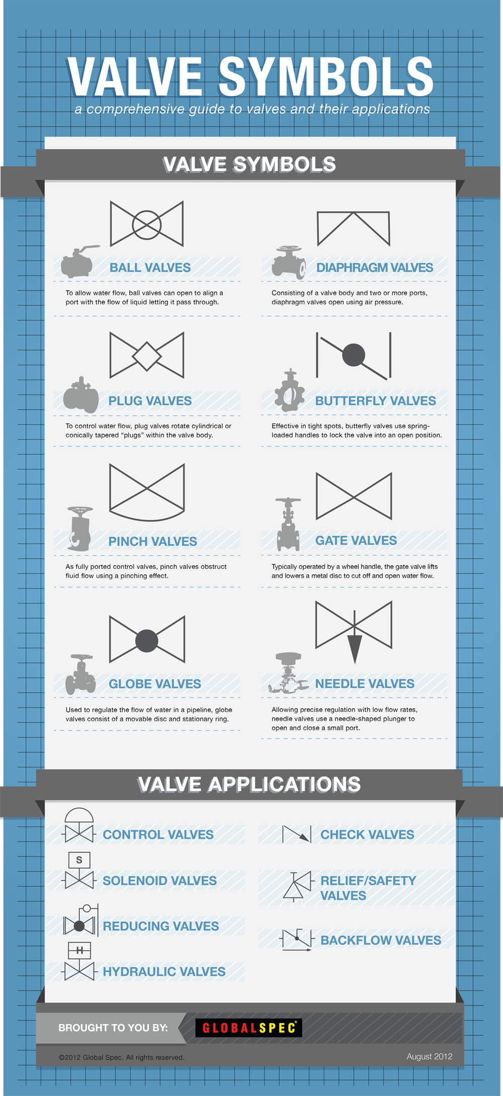 閥門符號用來表示壓力,流和方向的流體通過閥門。這些插圖,通常被稱為管道儀表流程圖(P & DI)符號,可以稍微組織之間但相似的草圖是用來識別的類型和位置的閥門變化。