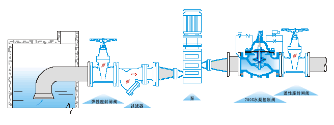 700X水泵控制閥由主閥、電磁導(dǎo)閥、針閥、球閥、單向閥、行程開關(guān)、微形過(guò)濾器和壓力表組成水力控制接管系統(tǒng)。水泵需停止工作時(shí),先由進(jìn)口壓使主閥關(guān)閉90%后,水泵停止運(yùn)轉(zhuǎn)。剩余10%由回水關(guān)閉。可防止水錘現(xiàn)象發(fā)生。