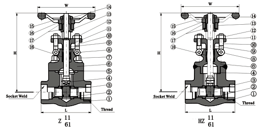 Z61H/Y、HZ61H/Y、HZ11H/Y型鍛鋼內(nèi)螺紋、承插焊閘閥 主要連接尺寸及重量