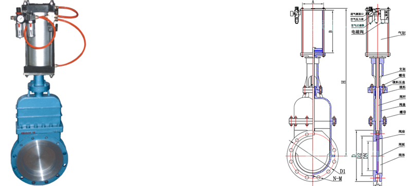 DMZ673H Pneumatic non-rising stem type knife gate valve with solenoid valve, close to switch, etc, can complete the action of two position control and signal output, also can complete automatic control of continuous motion, after installation of sleeve device gate, all moving parts in a closed state, can make the valve disc and stem lead screw drive will not unsmooth by lubricating oil dry, to prevent leakage of medium, suitable for use in gas pipeline containing dust or tar is especially suitable for long-term work in dust and dry environment.